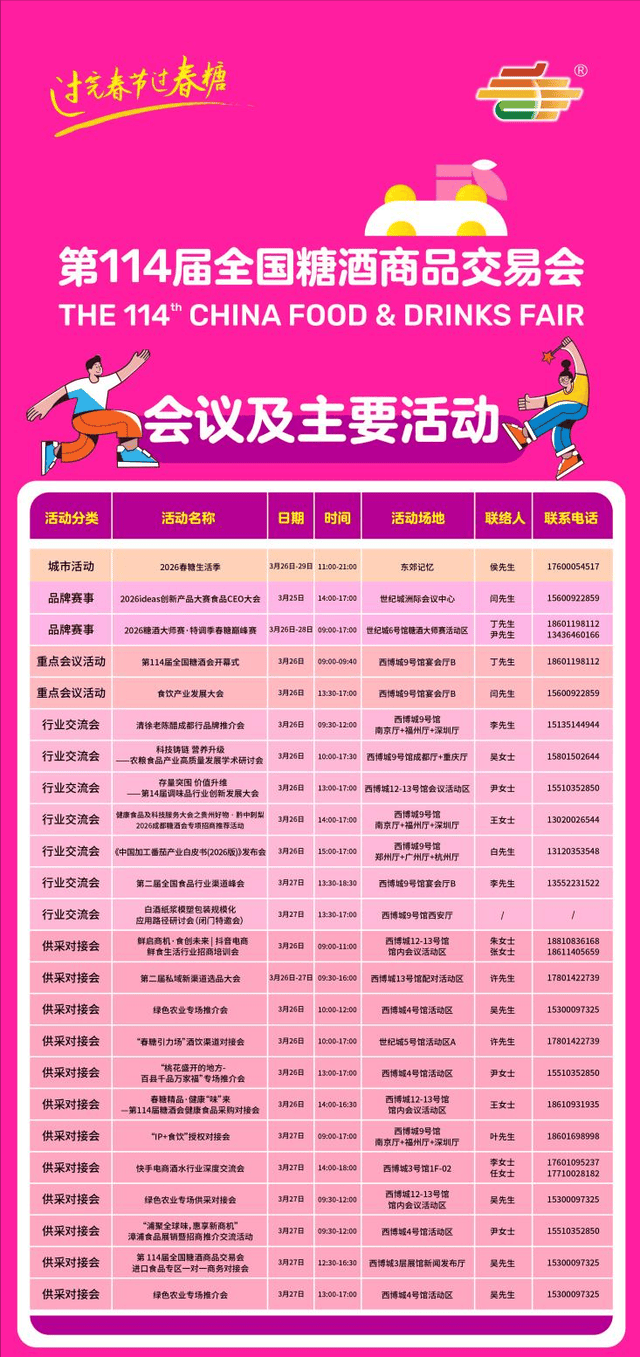 第114届全国糖酒商品买卖会将于2026年3月26日至3月28日正在中国西部国际博览城国际展览展现核心(以下简称西博城)、成都世纪城新国际展览核心(以下简称世纪城)举办,简介:宽窄小路由宽小路、窄小路和井小路平行陈列构成,天府美食岛一期聚焦米其林黑珍珠品牌、青年流量品牌、文化餐饮品牌正在内的岛屿消费新场景,都能精准中转、逛展即买卖。链接岛屿之上的艺术/音乐/品牌跨界等,全程约15分钟。本届春糖打制了多条理专业会议矩阵:从论坛“食饮财产成长大会”烧脑开讲,而是成都人本人私藏的“小众景点”。